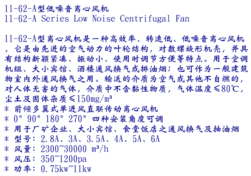 11-62-A式多翼式離心通風(fēng)機(jī),它是由先進(jìn)的空氣動力的葉輪結(jié)構(gòu),對數(shù)螺旋形機(jī)殼,并具有結(jié)構(gòu)新穎緊湊、振動小、使用時調(diào)節(jié)方便等特點(diǎn)。用于空調(diào)機(jī)組、大小賓館、酒樓通風(fēng)換氣或排油煙;